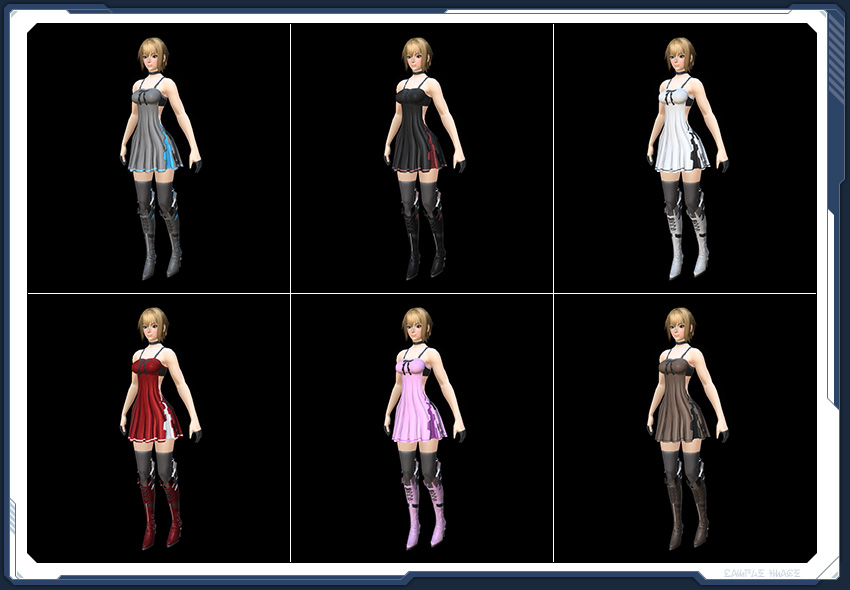 大胆に編み込まれたベルトが印象的な洗練されたデザインの戦闘服。淡く発光する肩のパーツが人目を奪う。