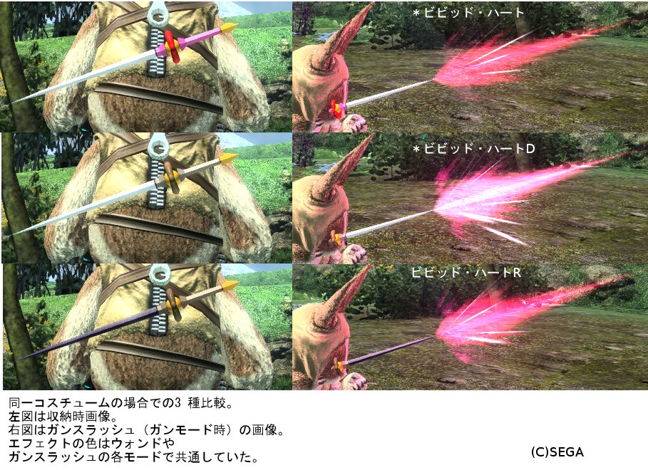 [添付] ※同一のコスチュームの場合での比較画像。 ※これは色が 1Pカラーで固定。ビビッド・ハートD は DNA カラー準拠、ビビッド・ハートR は RNA カラー準拠で、キャラクターのカラーに合わせて変化する。 なお、1P、2P、ハイパーが DNA カラー、3P、4P、闇の勲が RNA カラーである。そのため、フェイ・イェン 1P を着ている場合、無印と D の見た目が同じになる。 刀身は白、柄はピンク。