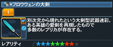 PSO2の説明文には「多数の」レプリカがあると書かれているが、PSOゲーム中に登場したものでは フロウウェンの弟子であるホルス・ミクが製作したレプリカしか登場しておらず、 オリジナルとあわせて2種類しかない(DBの剣はレプリカも10種類近く存在していた)。 フロウウェンの大剣もDBの剣も、「軍によるレプリカ」のみがセット効果の対象になる。