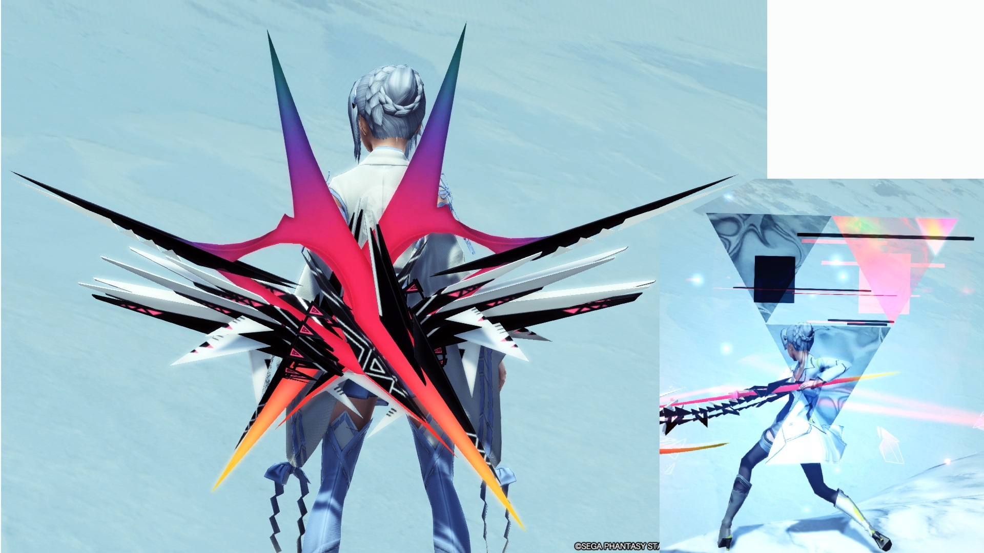 抜刀時、トライフォースを逆にしたものが背後に現れ、武器種ごとに違う三角形が選択された後、真紅から対応した後継クラスの色に変化するエフェクトがある --