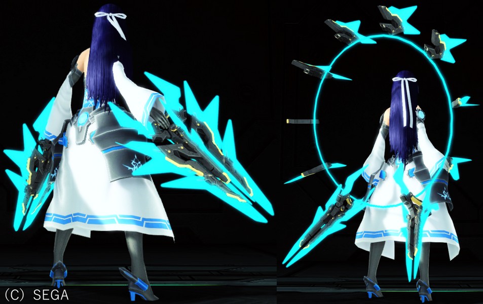 円環状の納刀状態から抜刀時に武器へと変形するデザインや、潜在能力「機動応変」の効果が特徴的なセット装備。
