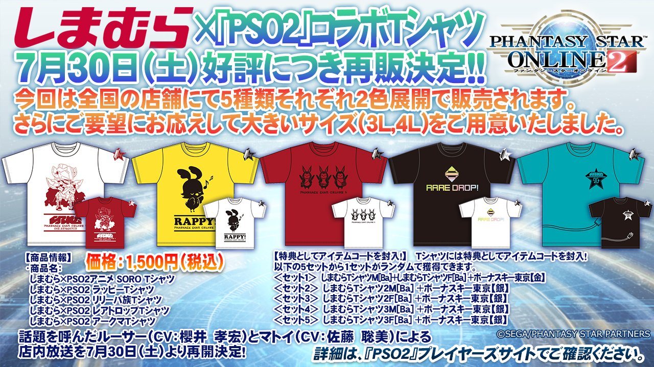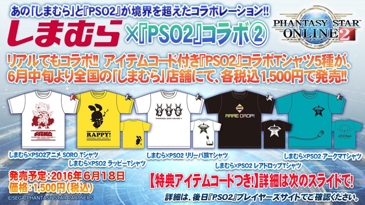 | 6月18日~(初回) 7月30日~(再販) | しまむらオリジナル『PSO2』コラボTシャツ発売!コラボTシャツはゲーム内で使えるアイテムコード付き! http://pso2.jp/players/campaign/shimamura/#contents_02 ![]() |