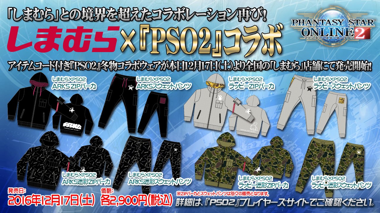 | 12月17日~ | しまむらオリジナル『PSO2』コラボウェア発売!コラボウェアはゲーム内で使えるアイテムコードが付くぞ! http://pso2.jp/players/campaign/shimamura02/#contents_02 ![]() |