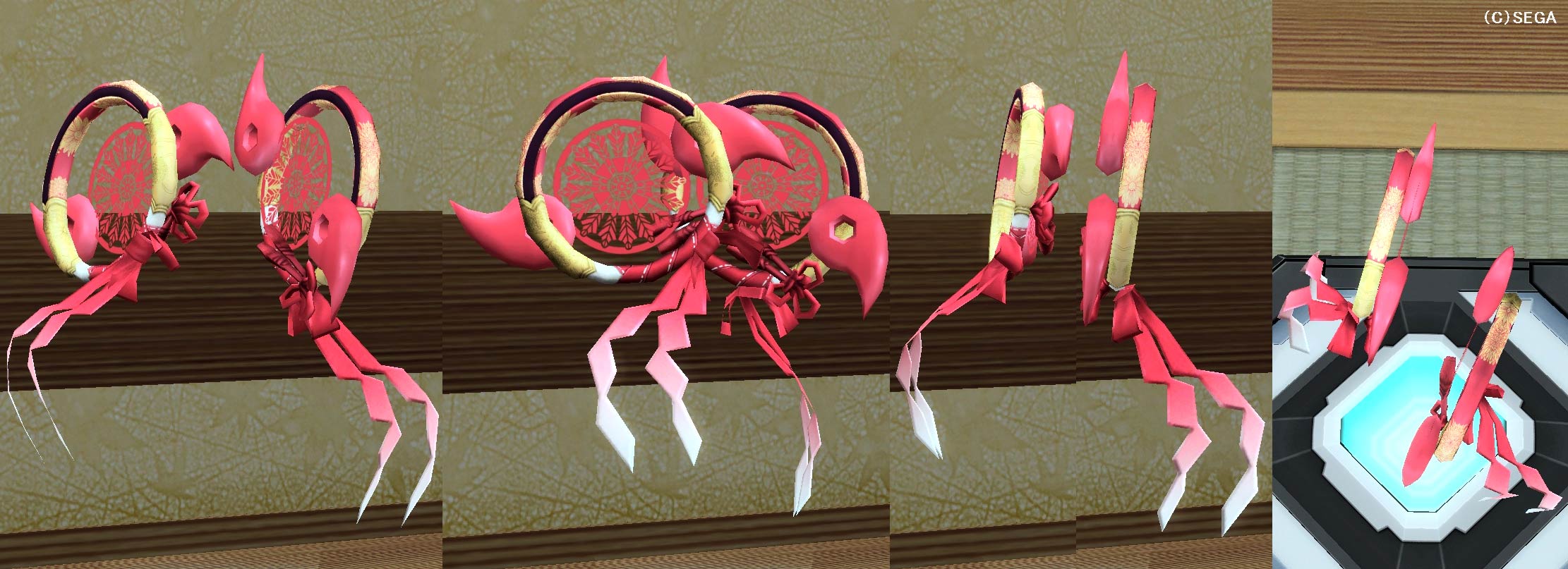 男性用コスチューム「カナギセイカイ」、女性用コスチューム「ヒメナギセイカイ」がモチーフ。 同型武器: ヤサカニノマガタマ ククノチノマガタマ 同系統武器: ヤサカニノマガタマ スサノグレン スサノヒキ ヒガンシャク