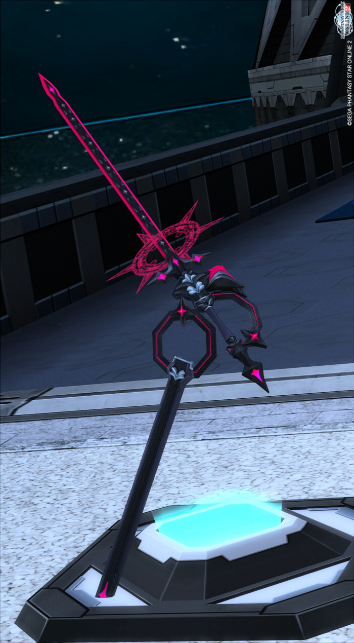 (C)SEGA ※抜刀時に、トゲのついたフォトンの輪の部分がクルクル回る。(画像クリックで拡大) (ホログラム展示時は鞘の先が装置に埋まっていたが、アップデートで鞘の位置が上部に修正された。)