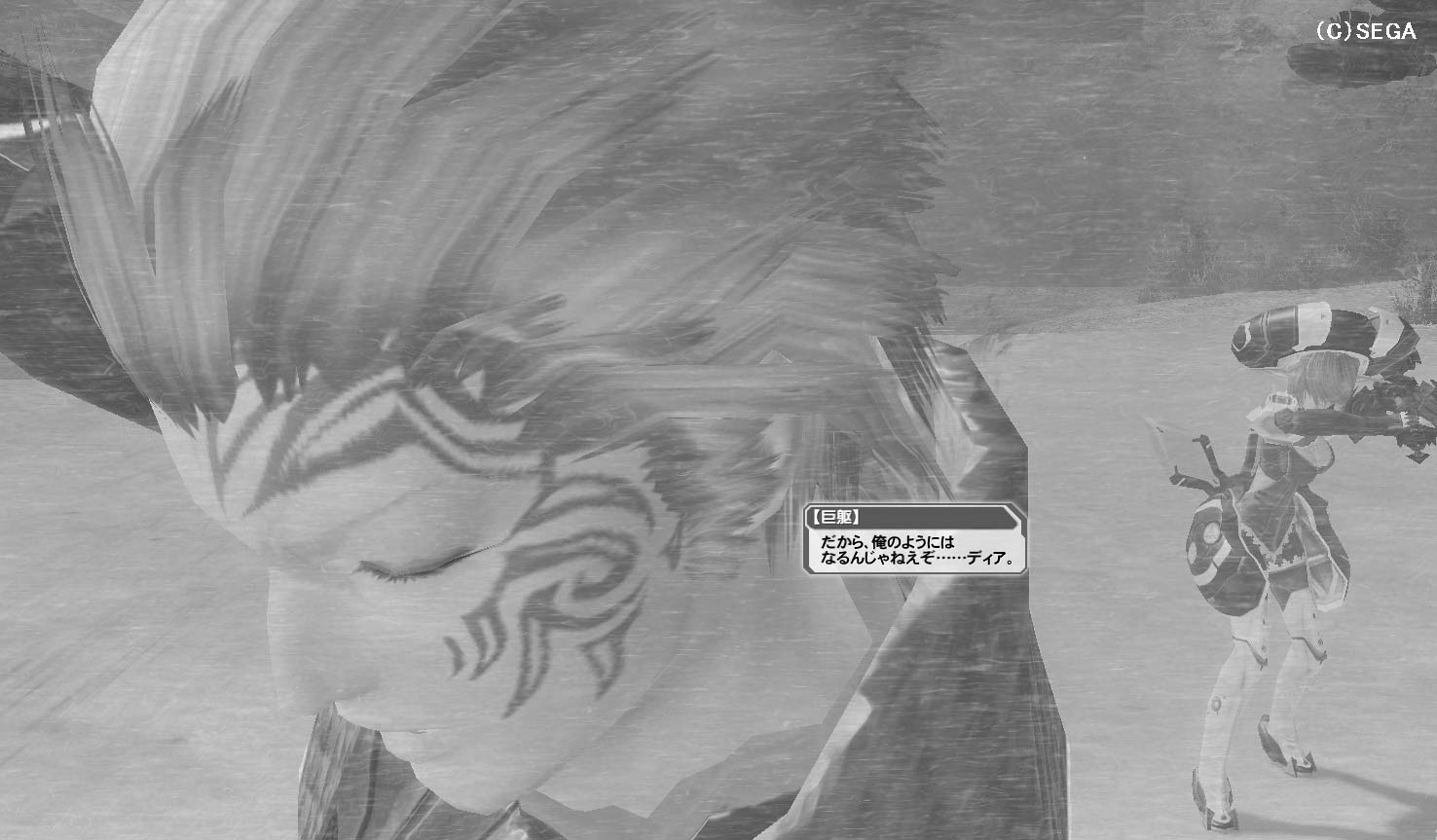 10年前のダークファルス襲撃時、メルフォンシーナを手に掛けたのは【若人】ではなく【双子】であった事が明らかになった(【EP1】のイベント「エンド・クラスター」にて【巨躯】が【双子】を「気に食わん2人組」と述べていたのはこれが原因)。 【双子】の攻撃からシーナ(メルランディア)を庇って攻撃を受ける。「ゲッテムハルト様!」と叫ぶメルランディアに対し、自分はダークファルス【巨躯】であってゲッテムハルトではないと否定した上で喝を入れようとするが、 その後【双子】を巻き込んで強引なテレポートを敢行しどこかへ消えていってしまったため、ゲッテムハルト(及び【巨躯】)の生死は不明だったが、後に【双子】に敗北し喰われたことが明かされた。 |