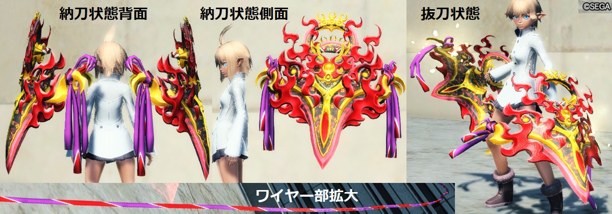 • 普通のワイヤーは平べったい面を背中に平行にして納刀しますが、この武器は背中に直角に納刀するため納刀SSを2通り撮影しました -- 2018-06-28 (木) 02:22:43