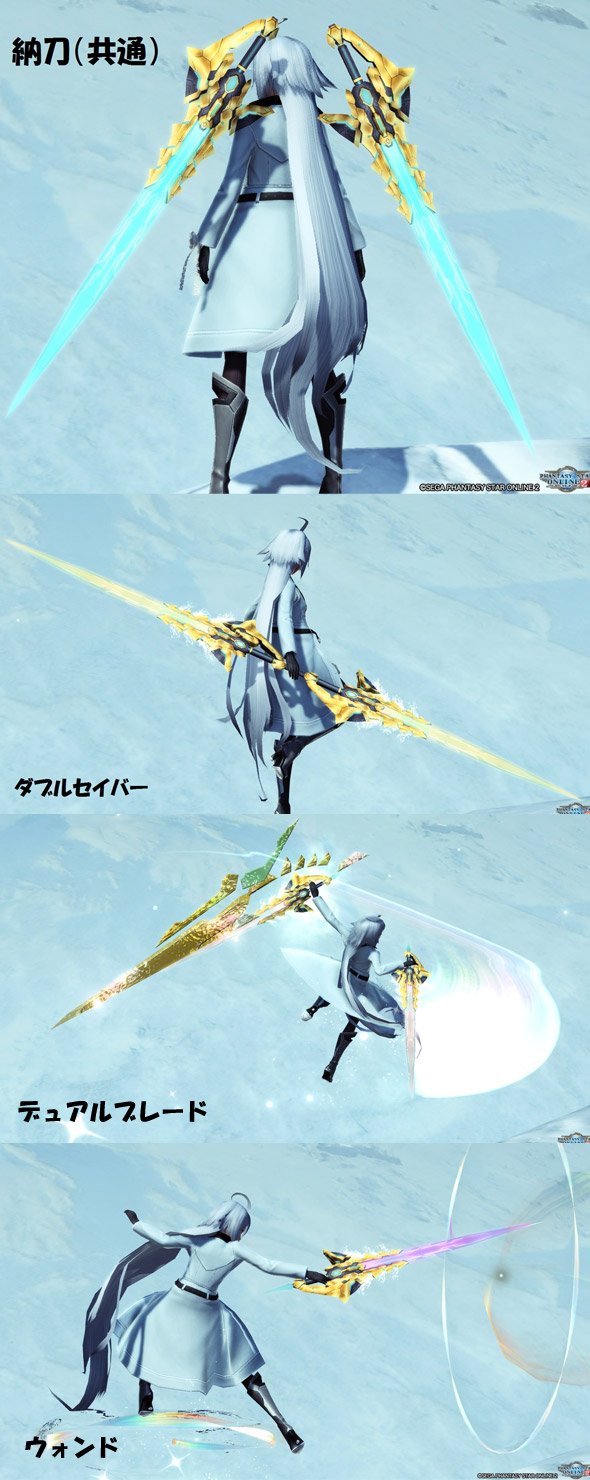 EP6メインビジュアルに描かれているエトワール男の持つダブルセイバー、エトワール女とルコットの持つウォンドの武器迷彩。 ダブルセイバー、デュアルブレード、ウォンドのエトワール武器3種に対応した武器迷彩。
