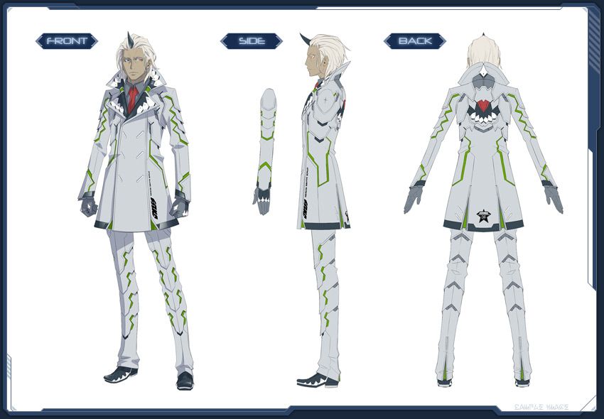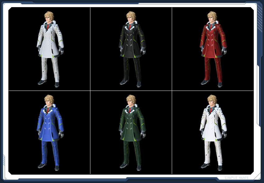 大きな襟と独特の模様が特徴的なアークスの戦闘服。タイトな作りだが動きやすく、丈夫な素材でできている。
