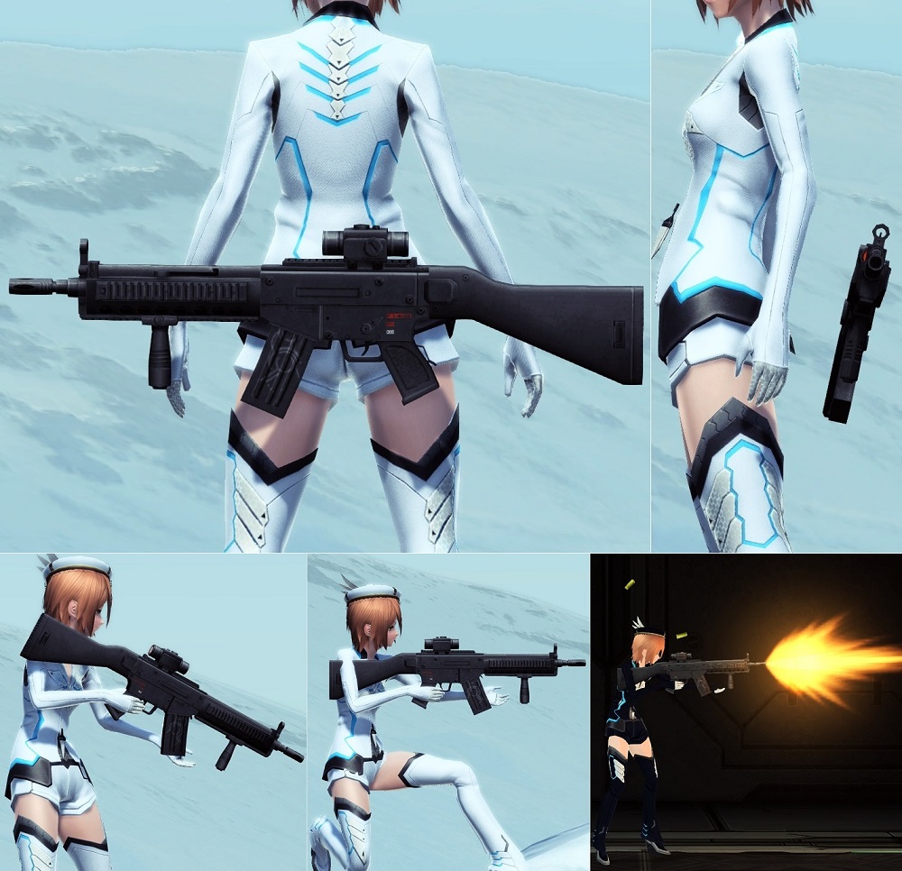 考察 銃弾が本体である関係上、その発射機構である銃は一定の形ではなく、アサルトライフル形態では比較的一般的なアサルトライフルの形状に、 ツインマシンガン形態では取り回しがたやすいライトマシンガンよりも更に小型のマシンピストル的な形状になる。 アースガイドのメンバーが使用する銃器もデザインやオプションの種類、有無が異なるがいずれも具現武装である以上広義にはこれと同系統と思われる。